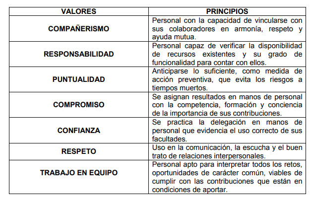 servicios, la organización opta por los siguientes valores y principios, para que cada uno